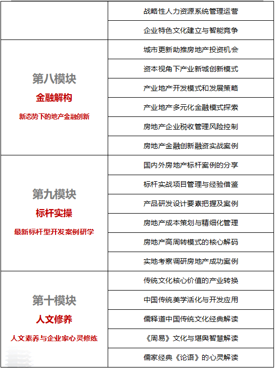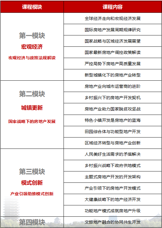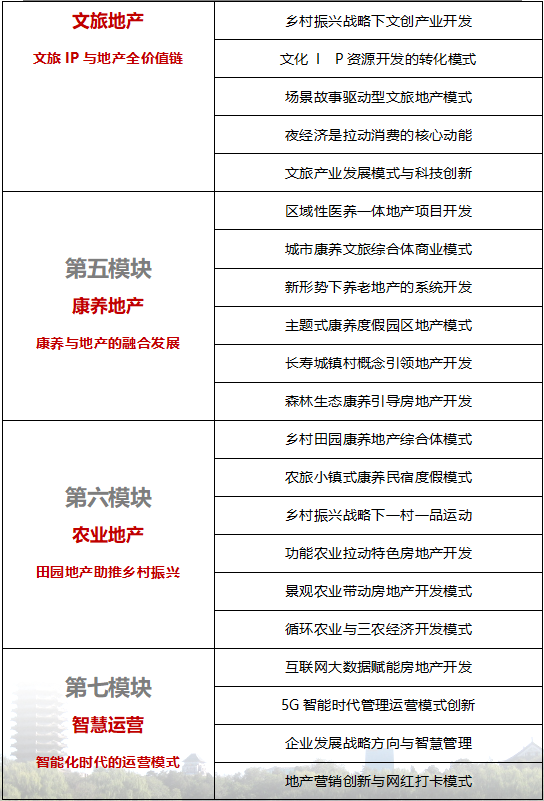 课程设置:1、宏观经济 2、城镇更新 3、模式创新 4、文旅地产 5、康养地产 6、田园地产 7、智慧运营 8、金融解构 9、标杆实操 10、人文修养,共计10大模块。