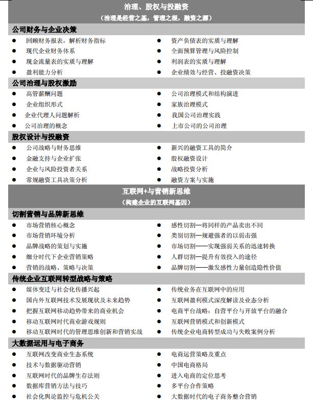 各行业领先的民营企业董事长、公司投资者、执行董事、控股股东、高级经理及有 志于从事企业经营的投资人与管理者。