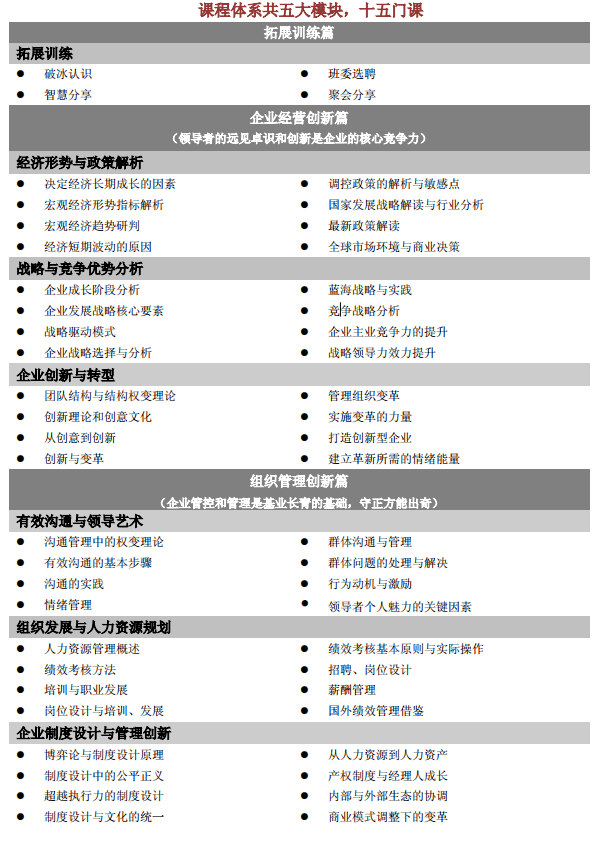 招生对象 | 各行业领先的民营企业董事长、公司投资者、执行董事、控股股东、高级经理及有 志于从事企业经营的投资人与管理者。 申请者须具有五年以上的管理实践经验。 |