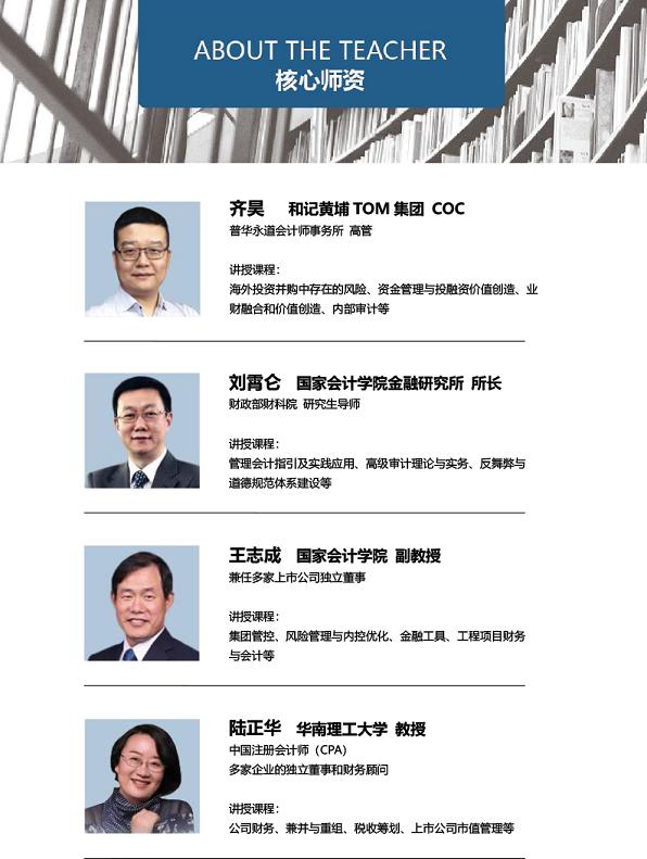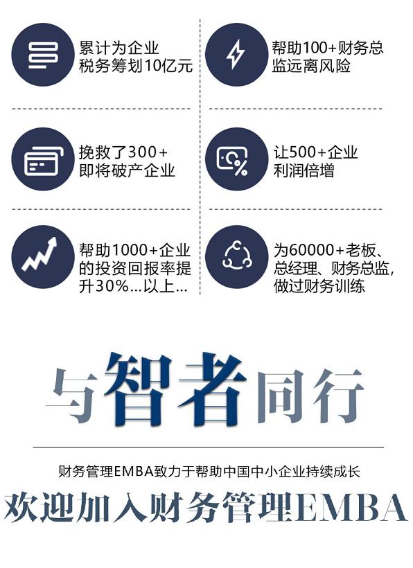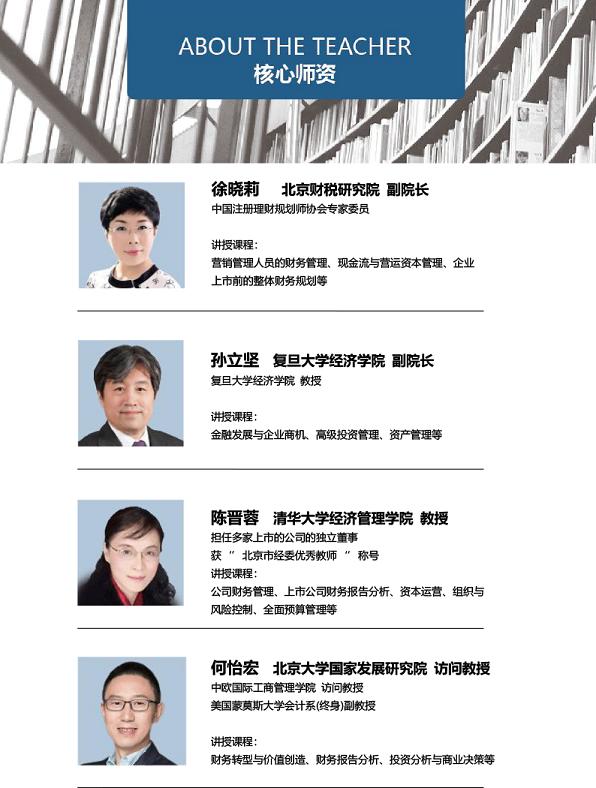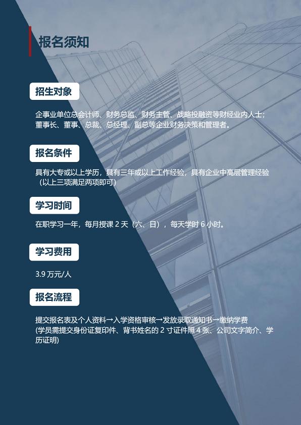 招生对象 | 企事业单位总会计师、财务总监、财务主管、战略投融资等财经业内人士;董事长、董事、总裁、总经理、副总等企业财务决策和管理者。 |